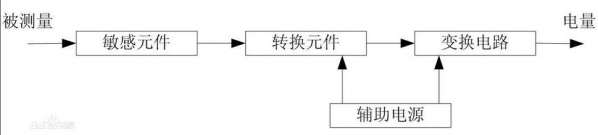 敏感元件:直接感受被测量,并输出与被测量有确定关系的物理量信号; 转换元件:将敏感元件输出的物理量信号转换为电信号; 变换电路:负责对转换元件输出的电信号进行放大调制; 辅助电源:如交流、直流供电系统。 ※ 当被测非电量可以直接被变换为电量时,敏感元件和转换元件可二者合一。例如:热电阻温度传感器利用铂电阻或铜电阻,可直接将被测温度转换成电阻值输出。