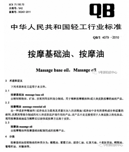 通过品目33.02的中英文描述我们都可以看到,该品目所说的精油混合物只是作为一种工业原料,并非成品,而我们所要做的保卫复方按摩油是一款成品,所以并不符合品目33.02的描述。那么不能归入品目33.02,又该归入哪里呢?我们先来看下按摩油的行业标准,如下: