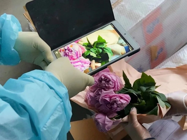 + ~3 v. H# T* h8 t, q, I: Y9 d, c“第一票是40件,535千克......在这边!”眼前这位关员叫王鹏宇,今年是他从事海关一线查验工作的第8个年头。逐项核对数量、重量、运单等内容后,王鹏宇用手中的查验pad对准一束玫瑰花苞,对焦、拍照、上传记录......仅几秒钟,这箱玫瑰鲜切花就有了自己的“身份证”。