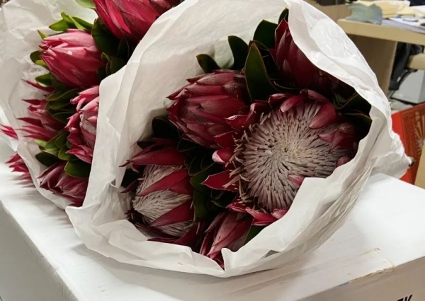+ c4 N6 t" h' Y& c! Y" }第二天一早,记者来到了北京朝阳区王四营盛华宏林花卉市场。“这些南非帝王花是准备发到石家庄的。”北京迎霄佳业商贸有限公司工作人员王磊正麻利地给花打包。在这里,记者见到了昨晚经海关查验后运来的几箱鲜切花。