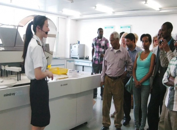 2 d% y) C9 i" a0 W& L3 G+ V▲志愿者向国外检疫官员介绍保健中心实验室检测能力