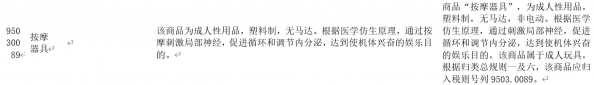 2、而在前一组案例中我们已经强调了品目95.03中玩具的特征——娱乐,且适用于儿童和成人。看到第一个产品的时候直观感受就是静态的、单一材质,仅是按照人体结构设计小件商品。从尺寸来看,不具有品目90.23的展示作用。从用途来看,因其材质特征接近于皮肤触感,不属于无用途的产品(按材质)。在使用说明上宣传了使用方法,所以按玩具进行归类。, r0 W! b# X, u! m) s$ @
